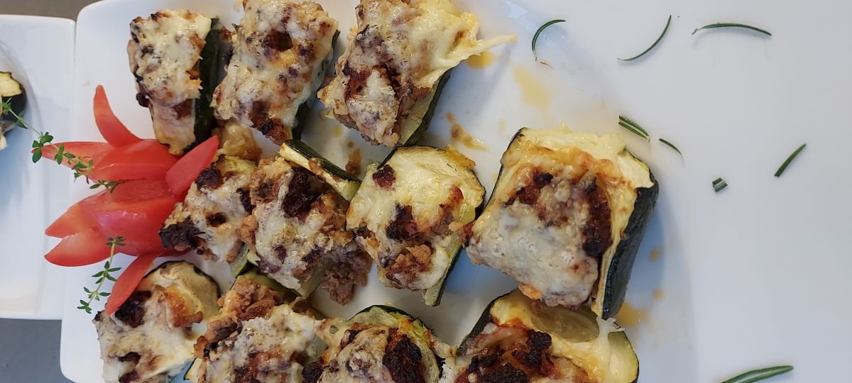 Bučke operemo in prerežemo po dolžini. Sredino bučk izdolbemo in drobno narežemo ali sekljamo. Na maščobi rahlo popražimo drobno narezano čebulo /šalotko, dodamo sekljan česen, da zadiši, dodamo mleto meso ter začimbe in dušimo pet minut. Dodamo izdolbene bučke in maso malo ohladimo. Primešamo polovico naribanega sira in nadev porazdelimo v izdolbene bučke, povrhu potresemo preostali sir in jih pečemo oziroma gratiniramo v pečici, ogreti na 180 stopinj Celzija, 20 minut.