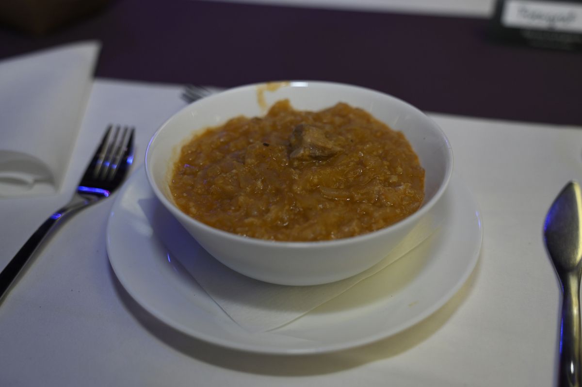 1kg kisle repe, 70 dag mesnatih svinjskih kosti, 2dcl prebrane oprane prosene kaše, 4 žlice tekoče masti, 1 žlica gladke moke, 1 čebula, ščep kumine, 20 zrn popra, 3 stroki česna, lovorjev list, sol.