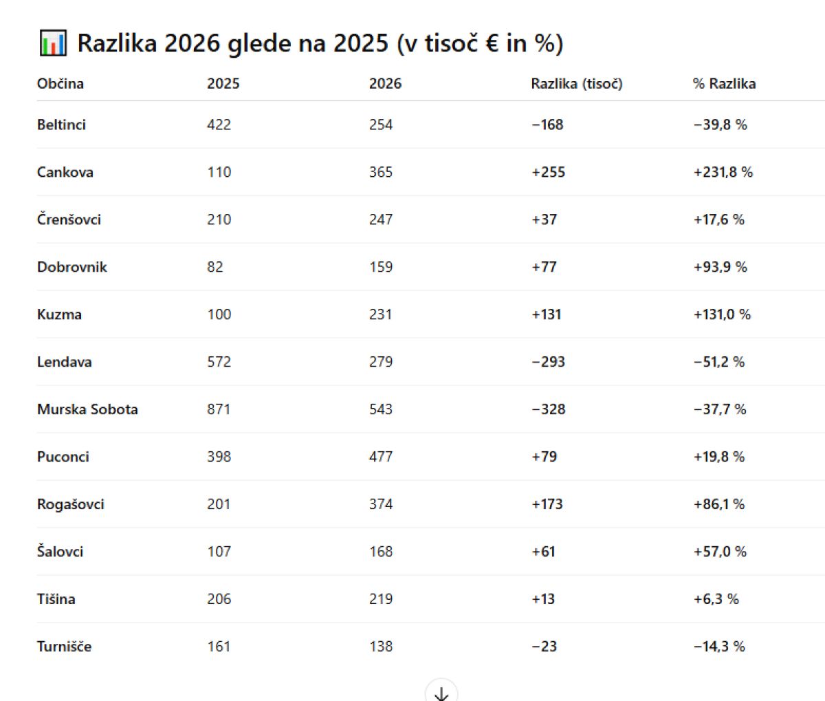 Soboška občina, ki je letos iz tega naslova prejela okoli 871 tisoč evrov, lahko drugo leto pričakuje 'zgolj' 543 tisoč evrov, kar je za okoli 328 tisočakov oziroma za blizu 40 odstotkov manj denarja. Odstotkovno se bo najbolj rezalo sicer pri lendavski občini, ki lahko pričakuje za več kot 50 odstotkov manj denarja. Letos so za Rome dobili okoli 572 tisoč evrov, prihodnje leto jim bo država dala 279 tisočakov. Za 40 odstotkov manj denarja bo prišlo tudi v Beltince, kjer so letos prejeli 422 tisoč evrov dodatnega denarja, v letu 2026 pa bodo le okoli 254 tisočakov. Razliko bodo, manj, ampak vedarle, občutili tudi v turniški občini. Letos so prejeli okoli 160 tisoč evrov, v prihodnjem letu pa okoli 138 tisočakov. Vse ostale prekmurske občine z evidentiranimi romskimi naselji bodo prihodnje leto prejele več sredstev. Nekatere občutno več.